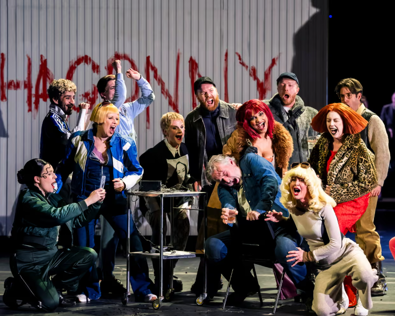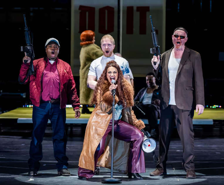 For a start, it’s big. In Brechtian style, the whole breadth and depth of the Coliseum stage is open: it feels almost as if this should be an immersive production, with the audience up there in the performers’ midst. Milla Clarke’s set, centred on a huge container, reuses elements that ENO regulars will recognise from productions long past, and the costumes look like the spoils from a charity-shop sweep – which fits the trashy aesthetic.